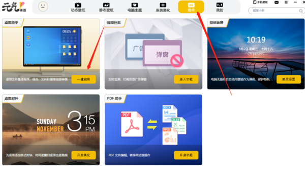 打开元气壁纸,在主界面上方找到【组件】,启用【桌面助手】,可以帮我们自动分类整理桌面的图标和快捷方式,可随时开关,非常方便。
