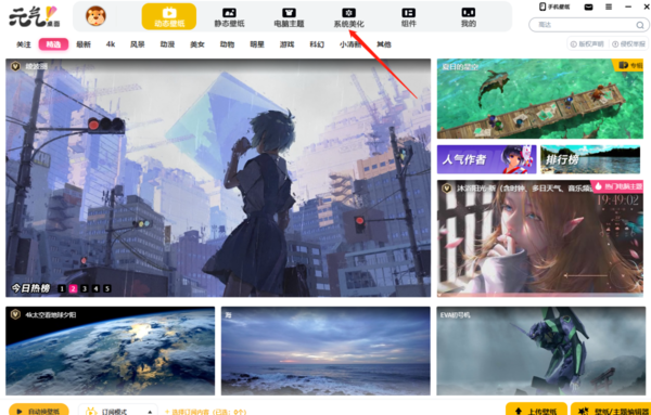 1、我们进入元气壁纸,在主界面上方找到【系统美化】;