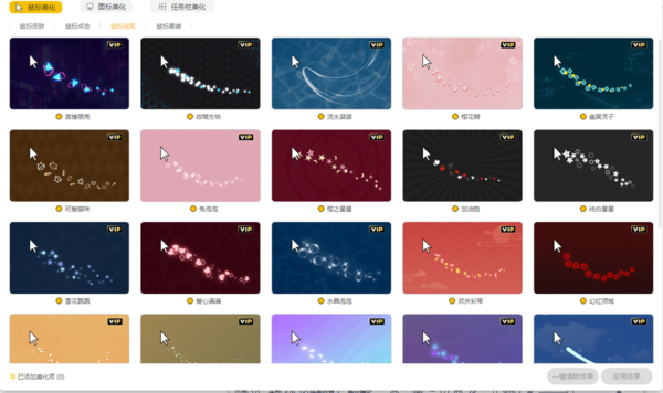 在【鼠标拖尾】中有非常多的样式,大家可以将鼠标悬停在各个效果中查看动画,选择自己喜欢的。