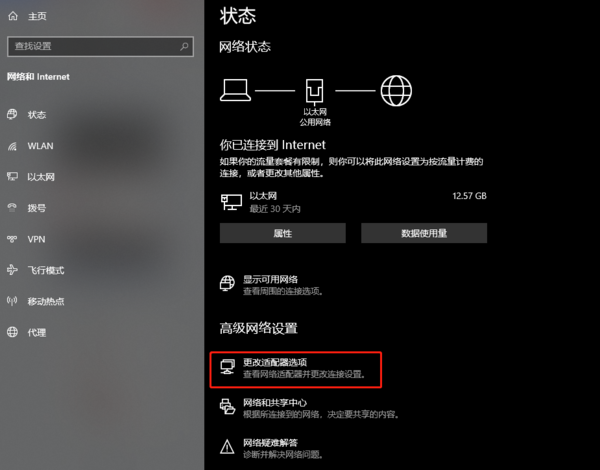 第二步,接下来就进入到了设置页面的主页,在右侧黑色背景的区域,向下滑动鼠标,找到“高级网络设置”,并点击“更改适配器选项”,进入到新的窗口。