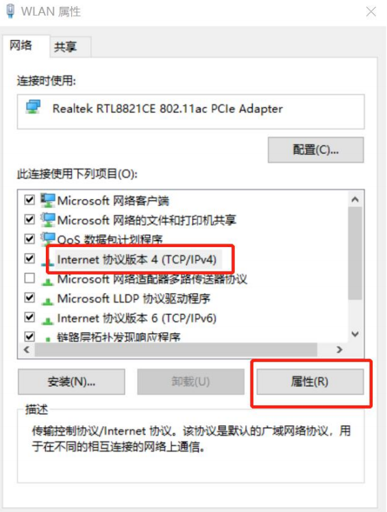 第四步,在“属性”页面中找到Internet?协议版本?4(TCP/IPv4),并勾选上,然后点击右下角的“属性”。