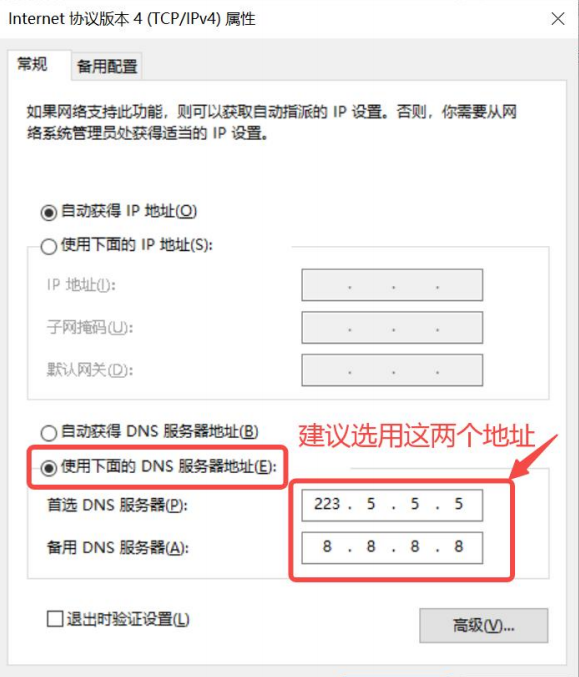 第五步,如下图所示,把页面中的“使用下面的?DNS?服务器地址”勾选上,然后输入图中红色方框所呈现的网络地址。