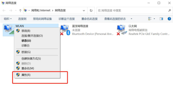 第三步,进入到网络连接的页面以后,将鼠标光标移动到WLAN位置,并点击鼠标右键,在弹出的菜单中选择最后一个“属性”按钮。