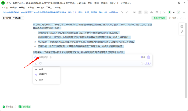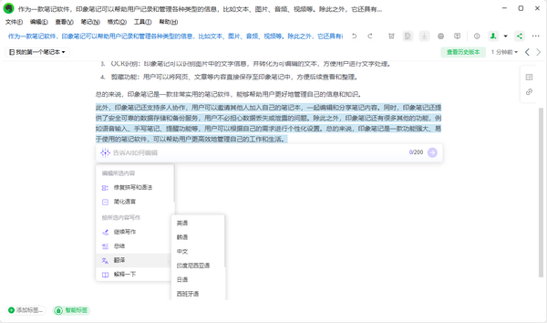 5、对已经写好的内容,印象AI也可以帮我们优化调整,只需要选中文字即可对笔记内容进行智能修改、简化、翻译、总结和续写。