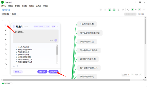 2、点击左侧印象AI的图标即可唤醒AI助手,在对话框中输入你想生成的思维导图内容,并点击【应用至导图】。