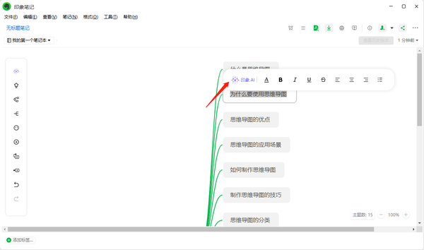 3、如果你还想对某个节点的内容进行扩写,可以选择节点,点击工具栏的印象AI图标即可扩写。
