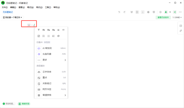 2、我们可以在文本框中先键入【/】或者是点击笔记前面的【+】图标,以召唤扩展菜单,接着,在扩展菜单中,我们可以看到【印象AI】所有的功能。