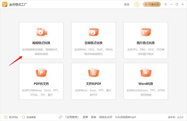 1、打开金舟格式工厂,点击【视频格式转换】。