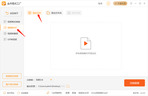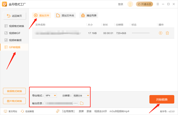 1、在【视频格式转换】页面中点击【GIF转视频】。点击【添加文件】将文件导入进去。选择导出格式、分辨率和输出路径,点击【开始转换】即可。