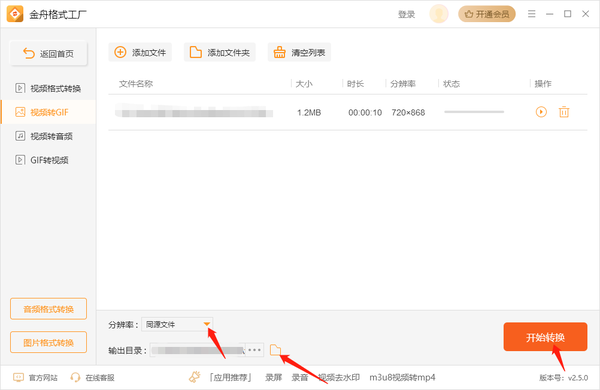 3、可选择设置文件的分辨率和输出目录,默认的是原文件夹,点击旁边的文件夹可更换位置。然后点击【开始转换】就可以了。
