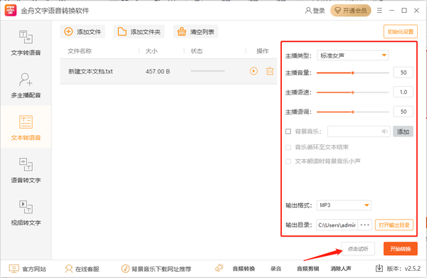 2、在右侧设置中,选择主播类型、音量、语速和语调,点击下方【点击试听】可试听效果。文字转成语音支持导出mp3、m4a、wav、amr这几种常见格式,在这里可自定义选择,输出目录也可自定义设置。