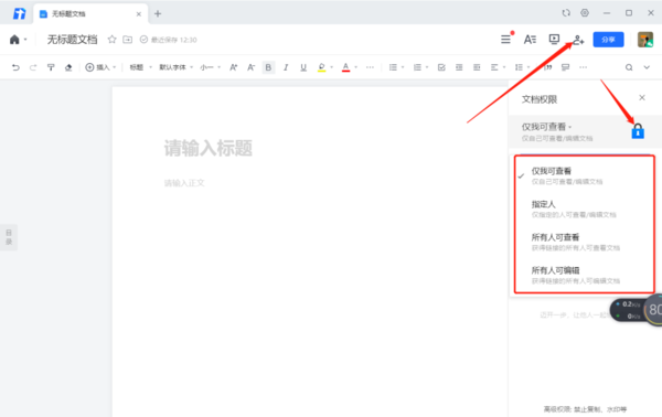 1,从腾讯文档的主界面新建一个在线文档之后,进入到编辑的区域,选择右上角的人像轮廓图标,就会弹出文档权限的设置页面,其中有“仅我可查看”、“指定人”、“所有人可查看”和“所有人可编辑”四种权限,我们需要选择第二个“指定人”,接下来就需要对指定人进行权限管理。