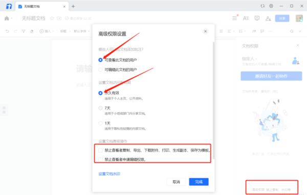 以上就是对分享出去的文件进行权限设置的方法了,通过以上设置可以有效的保护你的文件不被随意修改下载打印等操作。