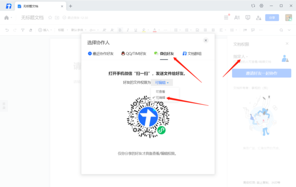 2,点击指定人之后,在弹出的页面上方有四种分享渠道,分别是“最近协作好友”、“QQTIM好友”、“微信好友”和“文档群组”,我们以微信好友为例,将页面切换到微信好友的标签页,下面就会出现一个腾讯文档的微信专属二维码,并在下方下拉列表中把好友的文件权限由“可编辑”更改为“可查看”,最后将这个二维码分享给微信上的好友即可,对方进入到文件以后就只能浏览不能修改了。
