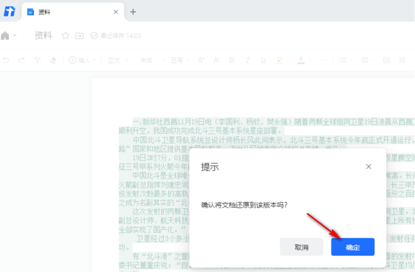 4、这时会弹出一个“确认将文档还原到该版本吗”的提示弹窗,我们点击右下角的蓝色“确定”按钮就即可。
