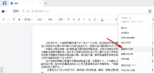2、选择三条红线的标志以后,可以在弹出的菜单列中找到“查看修订记录”这一条功能。