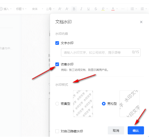 4、弹出了“文档水印”的设置页面,可以看到有“文字水印”和“访客水印”两种,我们将访客水印前方的方块打上对勾,然后就可以对下方的水印样式进行选择了,有“密集型”和“宽松型”,按照自己的喜好选择一个,然后点击下方的蓝色“确认”按钮即可,这边建议大家选择右侧的“宽松型”,因为左侧的“密集型”会影响到文字的阅读效果和阅读兴趣。