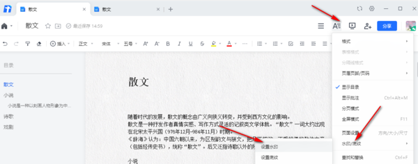 5、通过以上四步就可以在你的word文件里设置好底纹水印了,同时再给大家介绍一个快捷入口,就是在上方的工具栏中找到“编辑功能”的图标,同样可以快速进入“水印和底纹”这一设置页面。