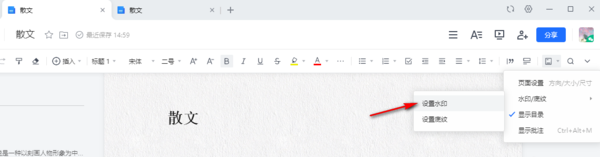3、下一步就是在“水印底纹”这个功能中点击子菜单中的“设置水印”按钮。