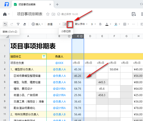 2、然后呢正常进行内容创作,当我们把内容全部填充好以后,接下来就需要把所有的数字进行设置成保存小数点后两位了,可以看到目前的表格里的数字都是保留了小数点后三位,先把包含数字的这一列全部选中,此时需要在上方的工具栏中找到“小数位数”这个功能。
