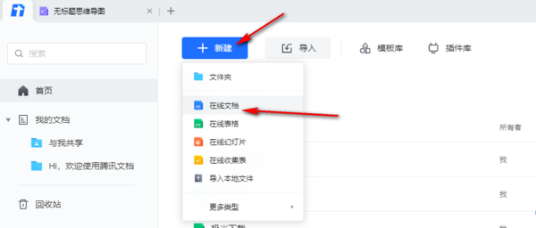1、在电脑桌面上找到腾讯文档的图标,双击启动以后,在首页点击蓝色的“新建”按钮,然后选择创作在线文档。