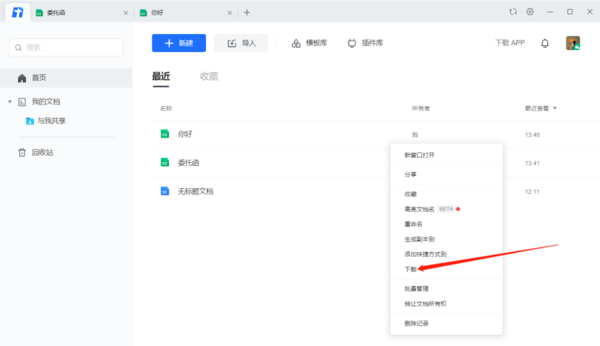 2、进入到腾讯文档的主界面以后,选择需要打印的文件,将光标放置在此处以后,点击三个点的选项,在弹出的菜单页中,找到“下载”两个字,然后点击一下。