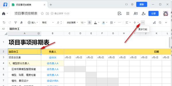 2、接下来在表格文件的页面,找到上方的工具栏,选择最右侧的三个黑点儿标志,点击一下就会出现“更多功能”的按钮。