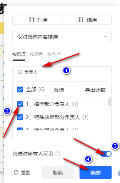 5、除了可以对表格内容进行由高到低的升降排序以外,这个操作窗口中还支持对关键词进行搜索,比如输入“负责人”三个字,下方就会出现所有包含负责人内容的表格项目,其中可以对筛选出来的项目进行权限管理,比如将“对所有人可见”的按钮打开,表示此内容是公开可见的,也可以把不想让所有人可见的内容通过搜索的方式筛选出来,然后关闭掉对所有人可见的按钮,选择好以后,点击右下角的蓝色确定按钮,这样这部分内容就不公开了。