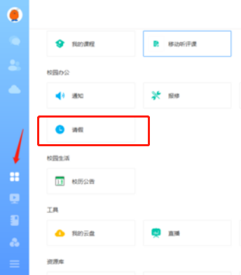 第一步,在超星学习通的电脑主界面点击左侧功能栏的四个小方块图标,也就是工具栏,然后在右侧的功能里选择“请假”并点击进入。