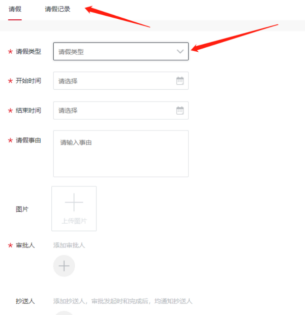 第二步,在请假的界面,按照提示框的类型进行逐一填写就好,有请假类型,开始时间,结束时间和请假事由,并在最后添加上审批人,如果有图片证明的话也可以上传图片。