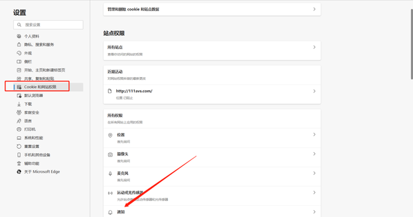 第二步,进入到设置页面后,在左侧有非常多的功能,我们找到中间位置的“Cookle和网站权限”,然后在右侧的主界面,向下滑动鼠标,找到“通知”这一栏,并点击进入。