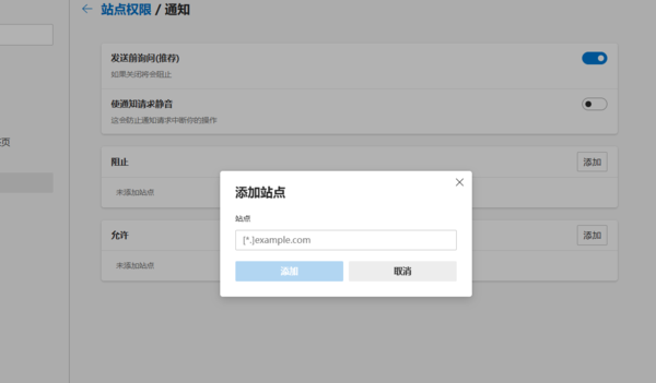 第三步,接下来就是设置的重要一步了,比如说我们想要把其中一个网站的权限给禁止掉,就可以在“通知”这一栏里面添加一个网址。