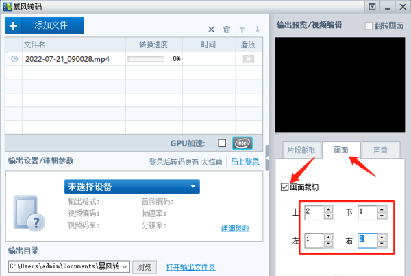 第五步,然后使用鼠标切换到“画面”的标签栏,在这个里面可以对视频内容进行裁切,通过在上下左右的数值框中输入具体的数值来决定裁剪视频画面的尺寸比例。