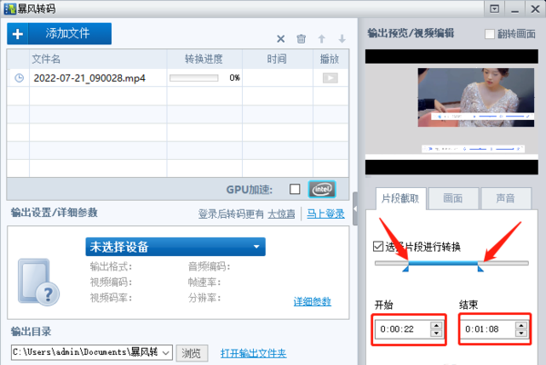 第四步,接下来就要在这个页面中进行编辑了,先在右侧的区域找到片段截取的标签栏,把“选择片段进行转换”打上对勾,然后就需要使用鼠标拖动下方的进度条来决定截取的开头和结尾了,也可以通过在右下角的开始与结束时间框输入开始与结束的时间,可以更加精准的获取想要截取的片段。