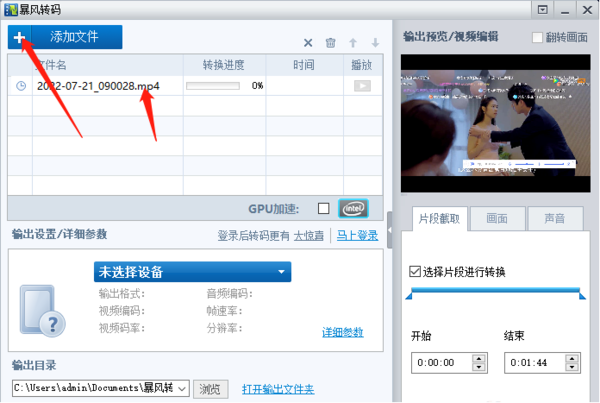第三步,在片段截取页面中选取左上角的“添加文件”按钮,把需要提取视频片段的视频上传到暴风影音的“片段截取”页面。
