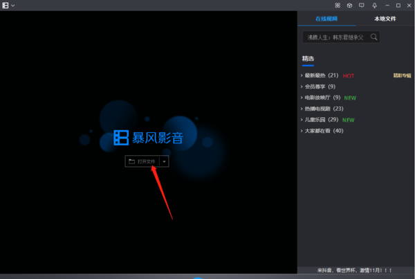 第一步,在电脑上下载安装好暴风影音并启动,在主界面的正中心有一个打开文件的按钮,我们点击进入。