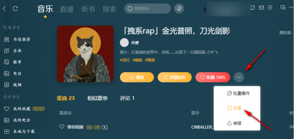 2、然后在这款歌单的主界面如下图所示,有三个小圆点的图标,点击进入后就会有“批量操作”、“分享”和“举报”的功能,我们点击第二个“分享”功能。