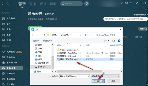 4、选择好以后,点击打开就开始上传了,上传到音乐云盘中可以进行相应的操作,比如分享,删除,播放或添加到歌单等操作。