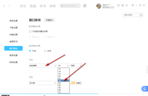 4,窗口歌词的设置页面可以调节字体的样式和字体大小以及颜色,我们进行相应的操作即可。
