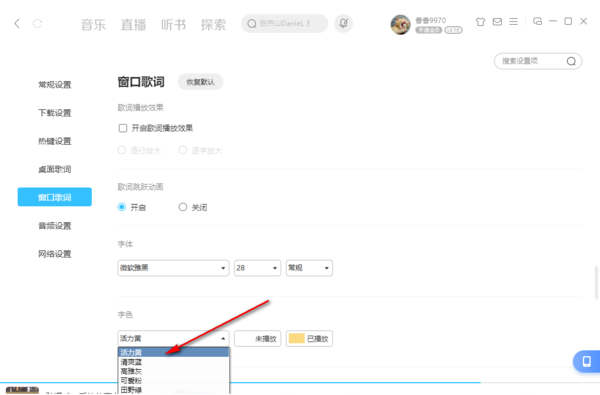 7,现在你知道在哪里找到修改字体和颜色了吗,当我们把窗口歌词的参数全部设置好以后,关闭设置页面,点击播放歌曲后,在电脑桌面上就可以看到新设置好的桌面歌词样式了,希望你新设置的颜色可以给你带来一整天的好心情。