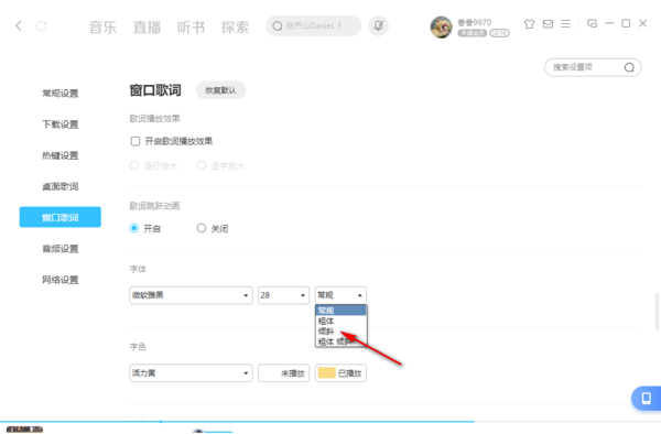 5,不仅如此,还可以对桌面上呈现的歌词是否需要加粗或者倾斜来进行修改。
