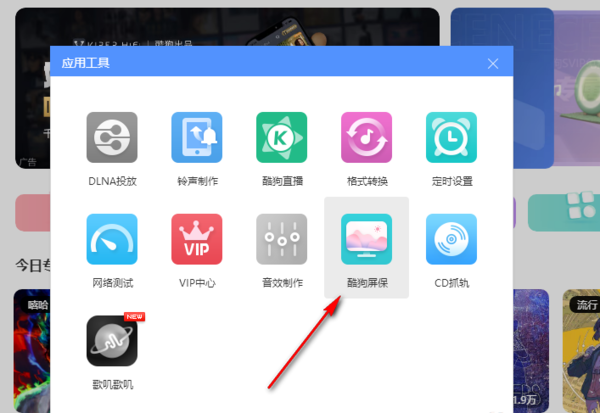 2、在应用工具里,找到“酷狗屏保”这一图标,点击进入到酷狗屏保的设置界面。