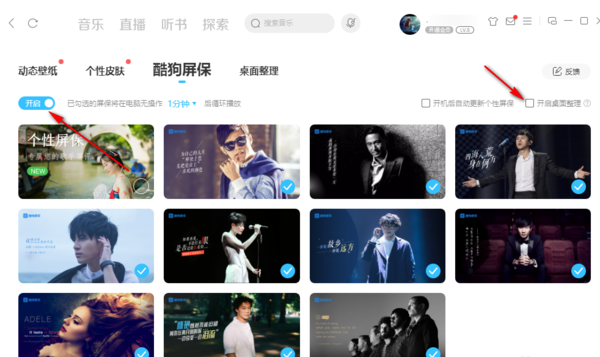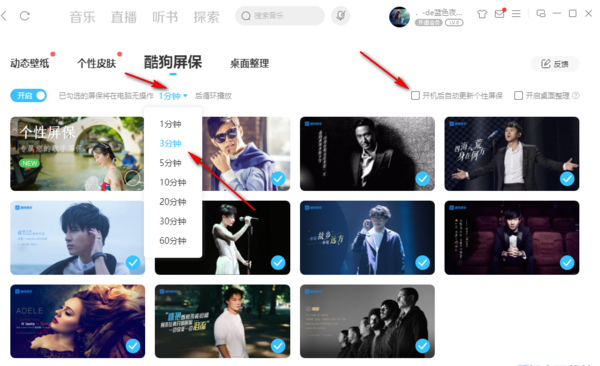 4、然后根据酷狗屏保提供的壁纸素材,把喜欢的内容并勾选上,同时需要设置一下开启屏保的时间以及是否需要在开机后自动更新个性屏保这一功能。