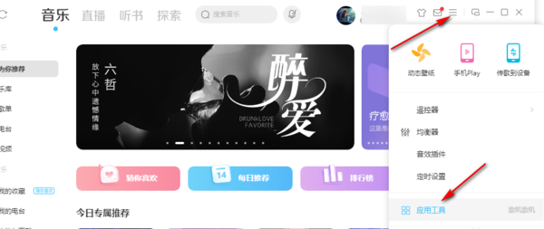 1、如果用酷狗音乐的壁纸做电脑设备的屏保,就需要在酷狗音乐的主页点击右上角的三条横线标志,找到“应用工具”。