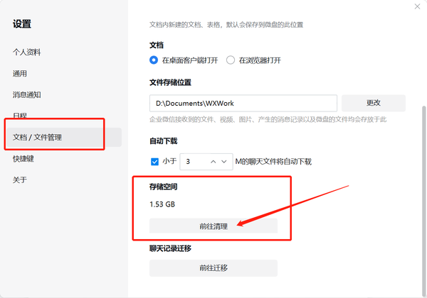 3,进入到设置页面以后,在左侧的功能栏选择“文档/文件管理”这一项,切换到这一项以后,右侧就会出现有关“文件存储位置”、“自动下载”、“存储空间”、“聊天记录迁移”等功能了。如下图所示,找到“存储空间”这一部分,可以看到小编的文件存储空间目前是1.53?GB,然后用鼠标点击“前往清理”的按钮。