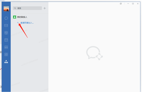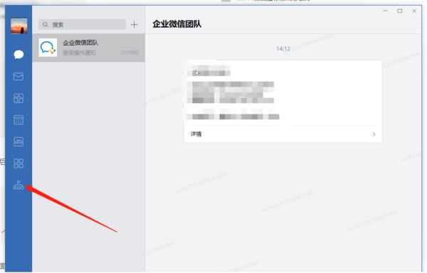 第一步,在电脑桌面上找到企业微信的图标,并双击进入主界面,看到最左侧的蓝色区域,点击最后一个图标,如下图的红色箭头指示区域。