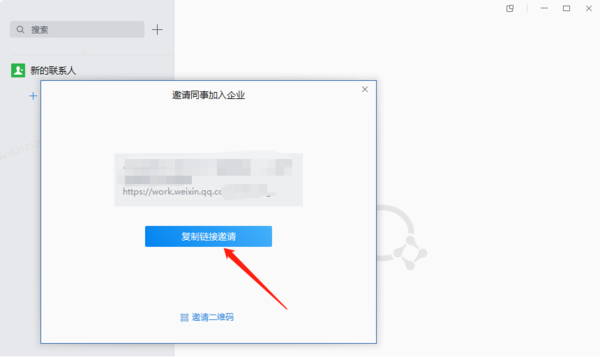 第三步,点击之后就会弹出一个邀请同事加入企业的页面了,然后点击页面中心蓝色背景的“复制链接邀请”六个字,就会将上方的邀请链接复制好,发给对方以后,对方复制到企业微信上就可以提示添加你为好友了。