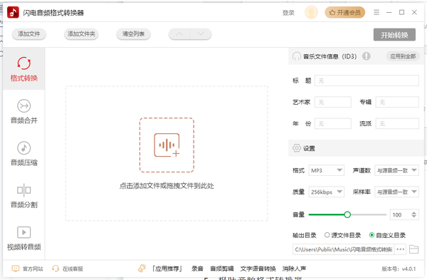 闪电音频格式转换器是一款轻便级音频格式转换器,支持常见音频格式互转、多个音频合并、音频压缩功能,还支持音频分割,可一键批量转换音频格式。每天可转换免费3次。
