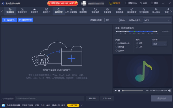 迅捷音频转化器是一款小巧、易用的音频转换软件,支持输出MP3、WAV9种主流音频格式转换,2M以内的音频可以免费转换。同时,它还具有批量转换功能,可以一次性转换多个音频文件。
