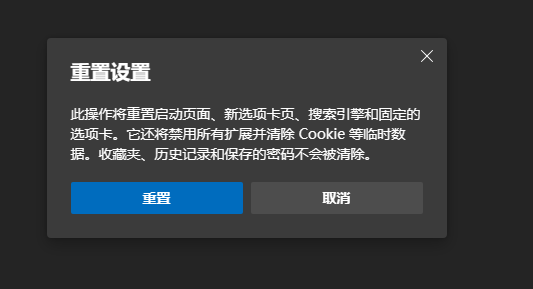 根据弹窗提示可以看到,重置操作将重置启动页面、新选项卡页、搜索引擎和固定的选项卡,还将禁用所有扩展并清除Cookie等临时数据,收藏夹、历史记录和保存的密码不会被清除。
